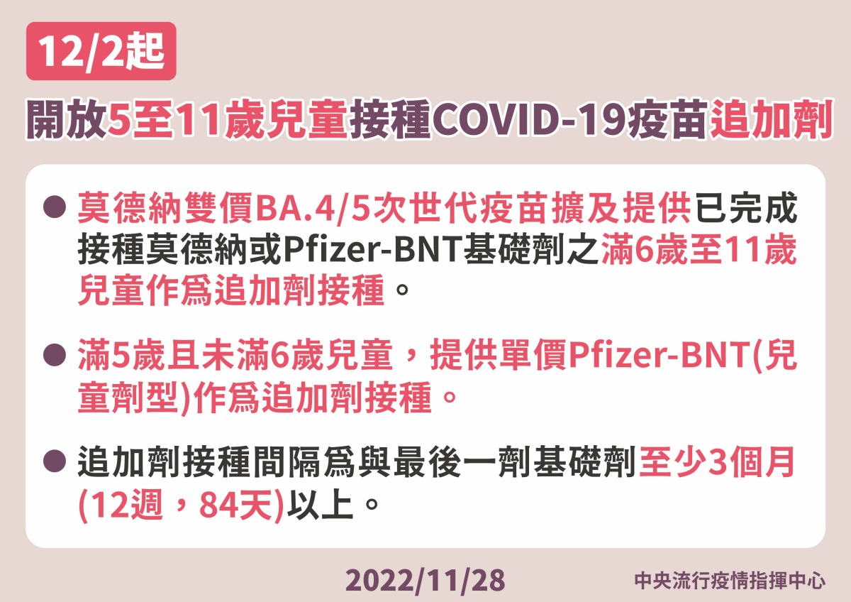 中央流行疫情指揮中心今(28)日表示,莫德納雙價BA.4/5次世代疫苗預計於今(2022)年12月2日起,提供已完成接種莫德納或BNT基礎劑之滿6歲至11歲兒童作為追加劑接種;另對於滿5歲至未滿6歲兒童,則提供單價Pfizer-BioNTech疫苗(兒童劑型)作為追加劑接種,以追加提供免疫保護力。