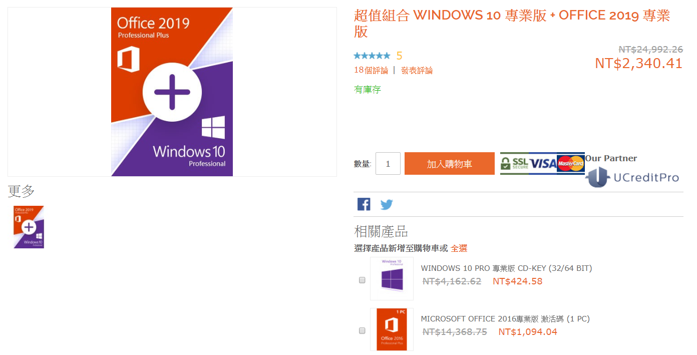 • Windows 10 專業版 + Office 2019 專業版 套裝 : 約 NT$1,638.28:點我購買