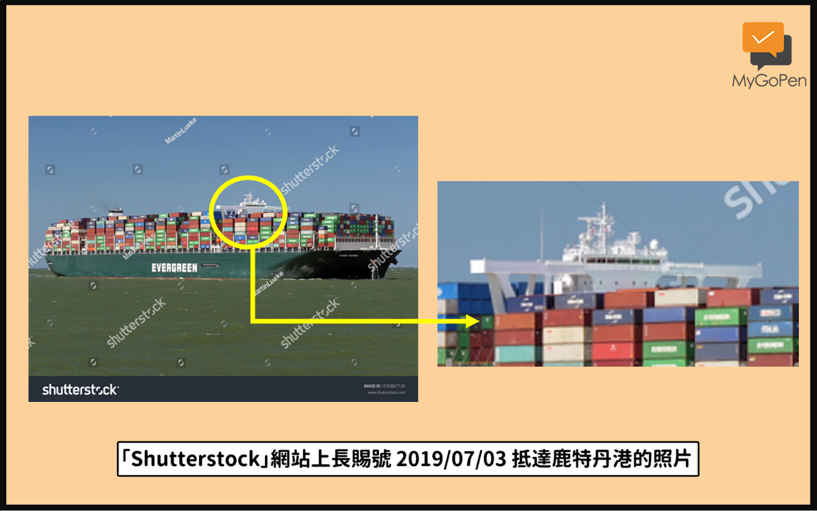 實際到「Shutterstock」網站以關鍵字查找到原圖,根據照片說明指出,這確實是長賜號沒有錯,但這是它在 2019 年 7 月 3 日抵達鹿特丹港的畫面,經查核記者比對船頭方向與貨櫃的排列順序,可確定網傳影片和此照片是同一時期所拍攝。