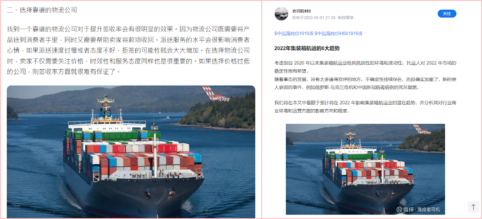 根據網站資訊指出,這是中國遠洋運輸集團(COSCO)的貨櫃船;以此為線索,在中遠官網上查找相關資料,但官網上沒有輪船的詳細照片,進一步在百度上搜尋,可以看到相同的照片出現在許多中國網路文章裡。