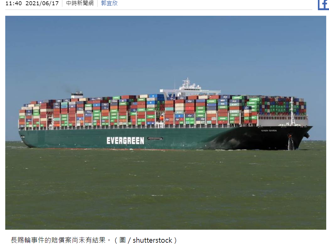 (一)將網傳影片截圖後以 Google 搜尋,初步先查找到《中時新聞網》在 2021 年報導長賜號擱淺蘇伊士運河事件的相關新聞中有相似的照片,其來源被標註為圖庫網站「Shutterstock」。