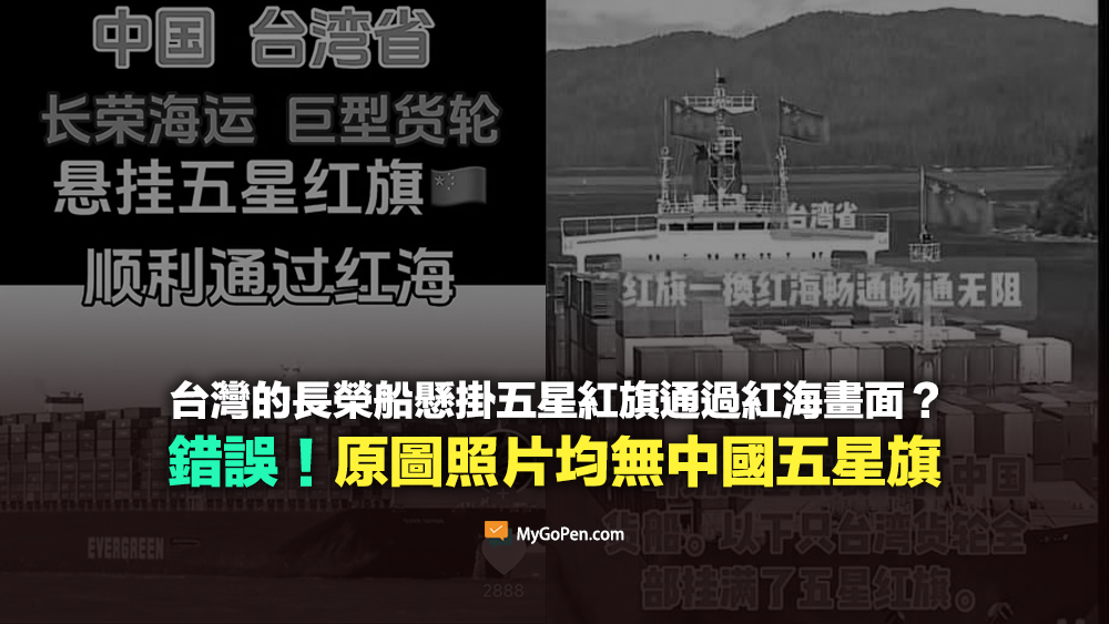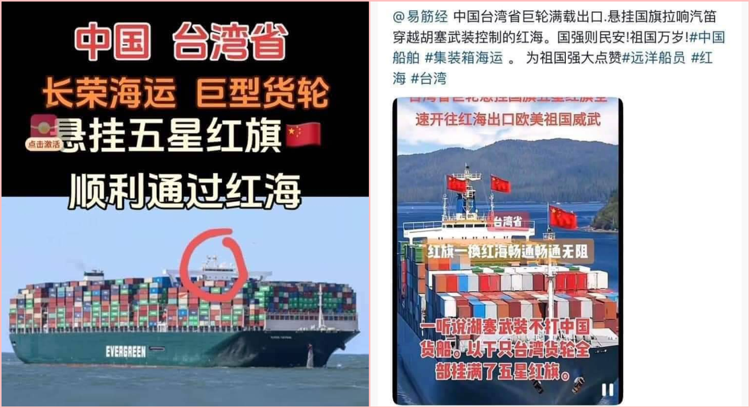 網傳「台灣的長榮船懸掛五星紅旗通過紅海」、「長榮集團的船運業務為了能順利安全通過紅海,掛上了五星級紅旗」等訊息和影片。經查證,傳言主要有兩個版本,一個是長榮海運的長賜號在 2019 年 7 月 3 日抵達荷蘭鹿特丹港的畫面,被指稱為中國五星紅旗的部分放大看後可以發現,其實那只是紅色貨櫃;另一個則是中國遠洋運輸集團的運輸船,但原圖中並沒有懸掛中國國旗。因受紅海危機影響,長榮海運目前仍停航紅海,傳言為錯誤訊息。