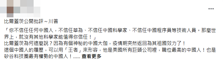 比爾蓋茲是否有公開批評川普:「你不信任任何中國人,不信任華為、不信任中國科學家、不信任中國程序員等技術人員。那麼世界上,就沒有其他科學家能值得你信任!」?