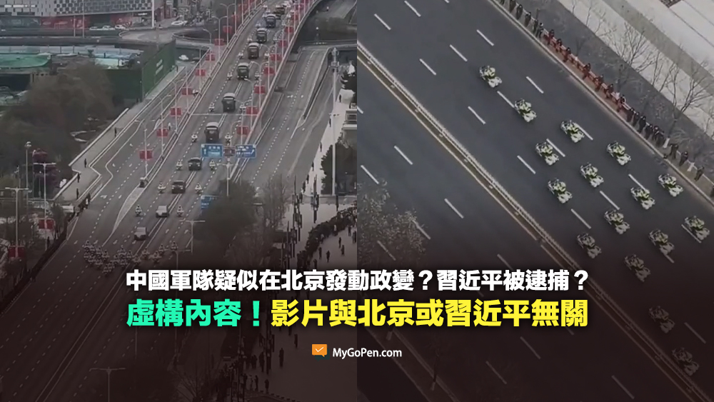 網傳「北京疑似發生政變」的影片及訊息,畫面是有疑似軍卡的車輛在中國街道上行駛,聲稱是有軍隊直接進入北京,疑似發生政變。經查證,中國於 2023 年 11 月 23 日舉行第十批在韓中國人民志願軍烈士遺骸回國迎接儀式,影片中的軍卡是載運韓戰陣亡將士的遺骸,而影片拍攝地點則是遼寧省瀋陽市的青年大街,與北京或習近平無關,網傳訊息為虛構內容,與事實不符。