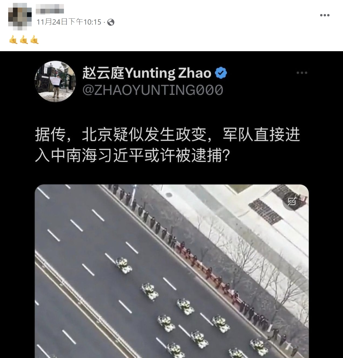 MyGoPen 檢視網傳訊息截圖,可以找到社群平台 X 用戶「赵云庭 Yunting Zhao 」2023 年 11 月 24 日發布的貼文,原始內容為一段 34 秒的短片,聲稱是在北京拍攝疑似發生政變的畫面。