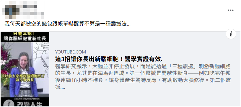 網傳「這 3 招讓你長出新腦細胞!醫學循證有效」貼文及影片,提到現代醫學已證實,有三種震撼式方法可以刺激大腦海馬迴腦細胞生長,包括間歇性斷食、溫度對比療法、高強度間歇訓練。但專家表示,從 1960 年代開始在動物實驗上看到的腦神經細胞新生的現象後,這個領域就一直是熱門的研究目標,後續也有死亡後人類腦細胞的體外實驗等各種研究、但正反結論都有,可見腦神經細胞再生與研究方法、實驗設計等各種條件有關,傳言不講長達至少半世紀以來,醫界有正有反、細節差異、迂迴進退的過程,內容過於簡略、通俗,傳言缺乏完整的宏觀視角、直接帶入日常行為,傳言易造成誤解。
