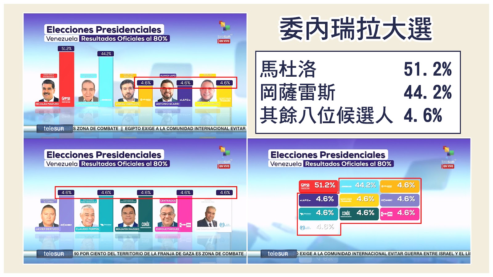 網傳「委內瑞拉大選得票率有問題」的圖片及訊息,內容聲稱委內瑞拉於 2024 年 7 月 28 日舉行的總統大選,5 名候選人票數加起來為 109%,認為選舉有舞弊。經查證,網傳圖片出自南方電視台(teleSUR)的報導,該圖卡實際上有兩張,主要展示參與委內瑞拉總統大選的 10 名候選人的得票率。該圖卡引用委內瑞拉選委會在選票開出 80% 時發布的數據,當時只有現任總統馬杜洛(51.20%)與反對黨候選人岡薩雷斯(44.02%)有詳細票數與得票率,其餘 8 名候選人並未公布「個別」得票率,而是得票率「總和」為 4.6%,因此才會每個人都顯示 4.6%,網傳訊息未說明圖卡代表的意義,容易造成民眾誤解。