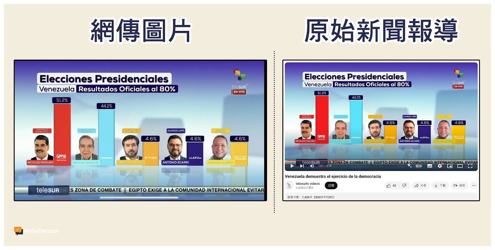 儘管委內瑞拉選委會已於 8 月 2 日宣布馬杜洛成功連任,不過 MyGoPen 在 8 月 4 日發布的查核報告中,有提到反對派認為此次選舉不公,號召全國群眾上街抗議;歐盟也認為選委會未提供官方投票紀錄,不承認馬杜洛的勝選,並呼籲盡快公布選舉紀錄。