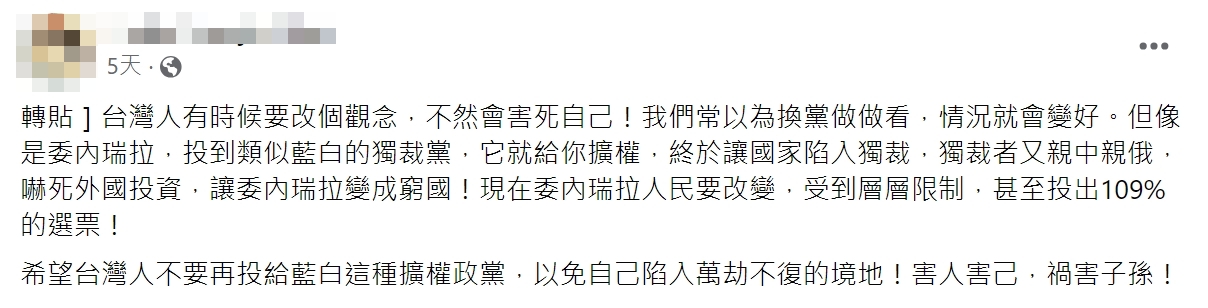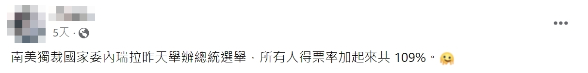【錯誤】委內瑞拉大選得票率超過109%?誤導描述!忽略圖卡原始脈絡