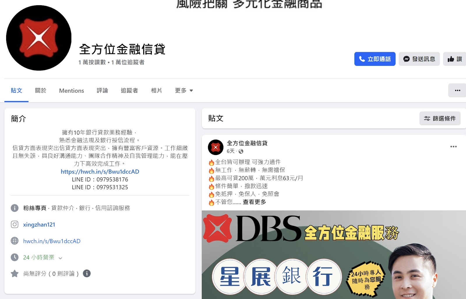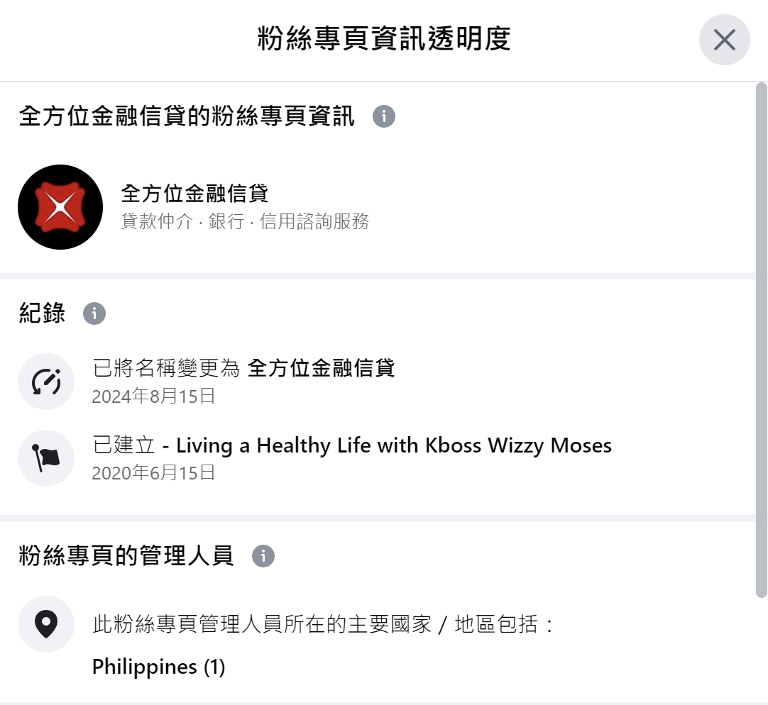 檢視該粉專主頁,可以看到頭像是使用星展銀行的商標,簡介部分聲稱有 10 年銀行信貸經驗, 並且附上 24 小時免費諮詢連結及 LINE ID。民眾如果想要查詢粉專是否為詐騙,可以點擊「關於 → 粉絲專頁資訊透明度 → 查看全部」,會發現該粉專成立於 2020 年 6 月 15 日,原始名稱叫做「eLiving a Healthy Life with Kboss Wizzy Moses」,但在 2024 年 8 月 15 日時改名為「全方位金融信貸」,粉專管理人竟然還是菲律賓人。