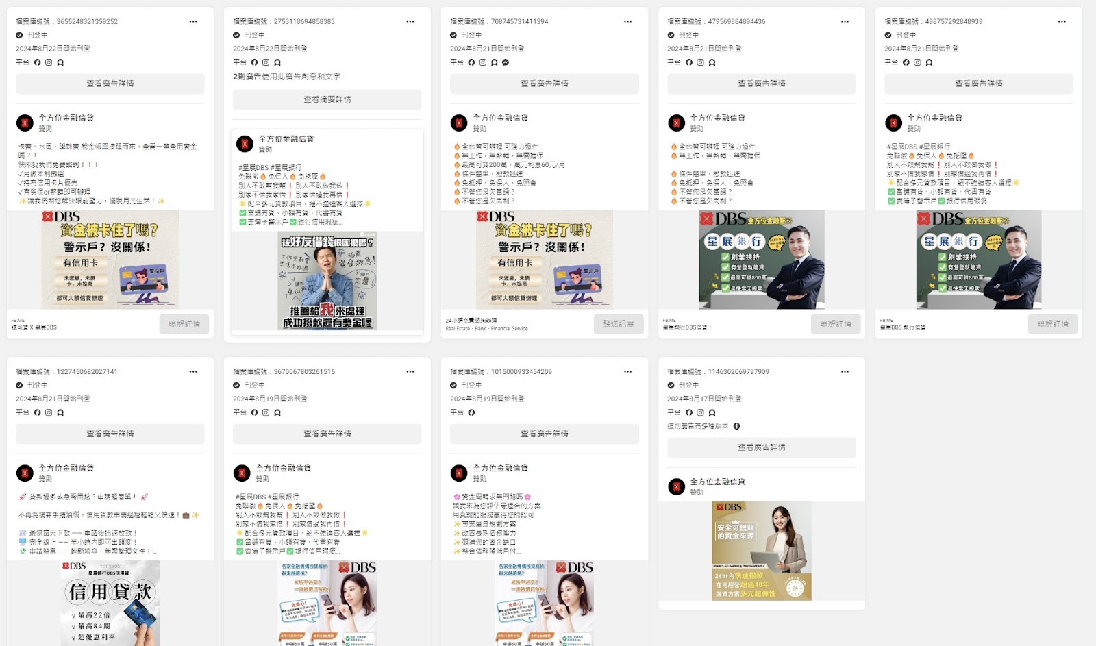 檢視臉書廣告檔案庫,發現該粉專改名後,大約從 8 月 17 日開始在臉書上投放廣告,雖然文案內容也些許不同,但大致上都是要民眾來借錢,並註明是線上申請、迅速放款。