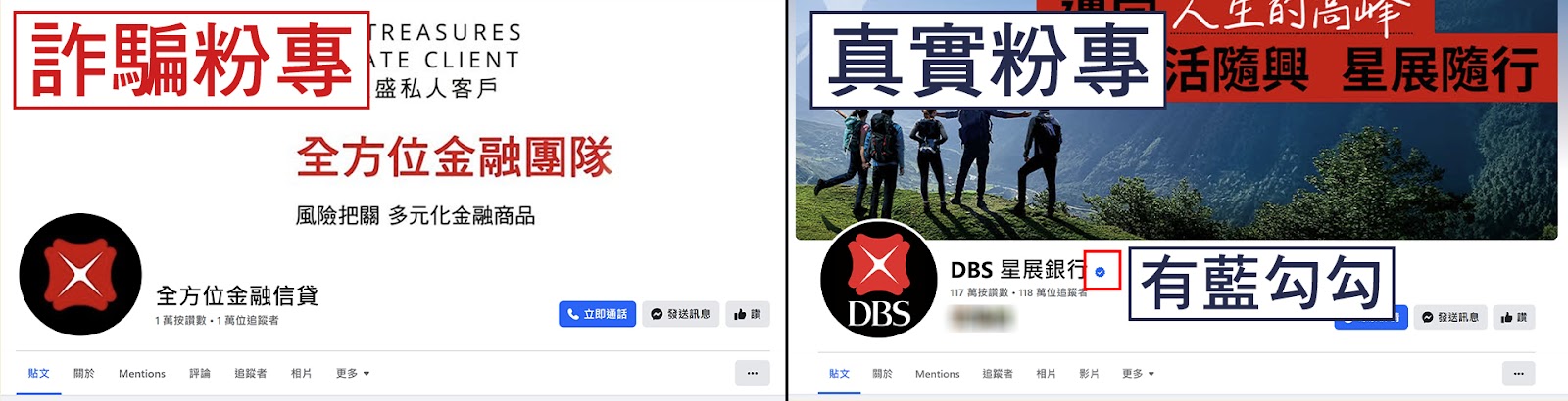 此外,詐騙粉專雖然使用星展銀行的頭像,但是粉專並沒有官方認證的藍勾勾。真正的星展銀行粉專名稱為「DBS 星展銀行」,有超過 118 萬追蹤者且有 Facebook 官方認證標章。粉絲專頁資訊透明度可以看到在 2013 年 7 月 18 日即成立專頁,管理人員有超過 50 名台灣人。