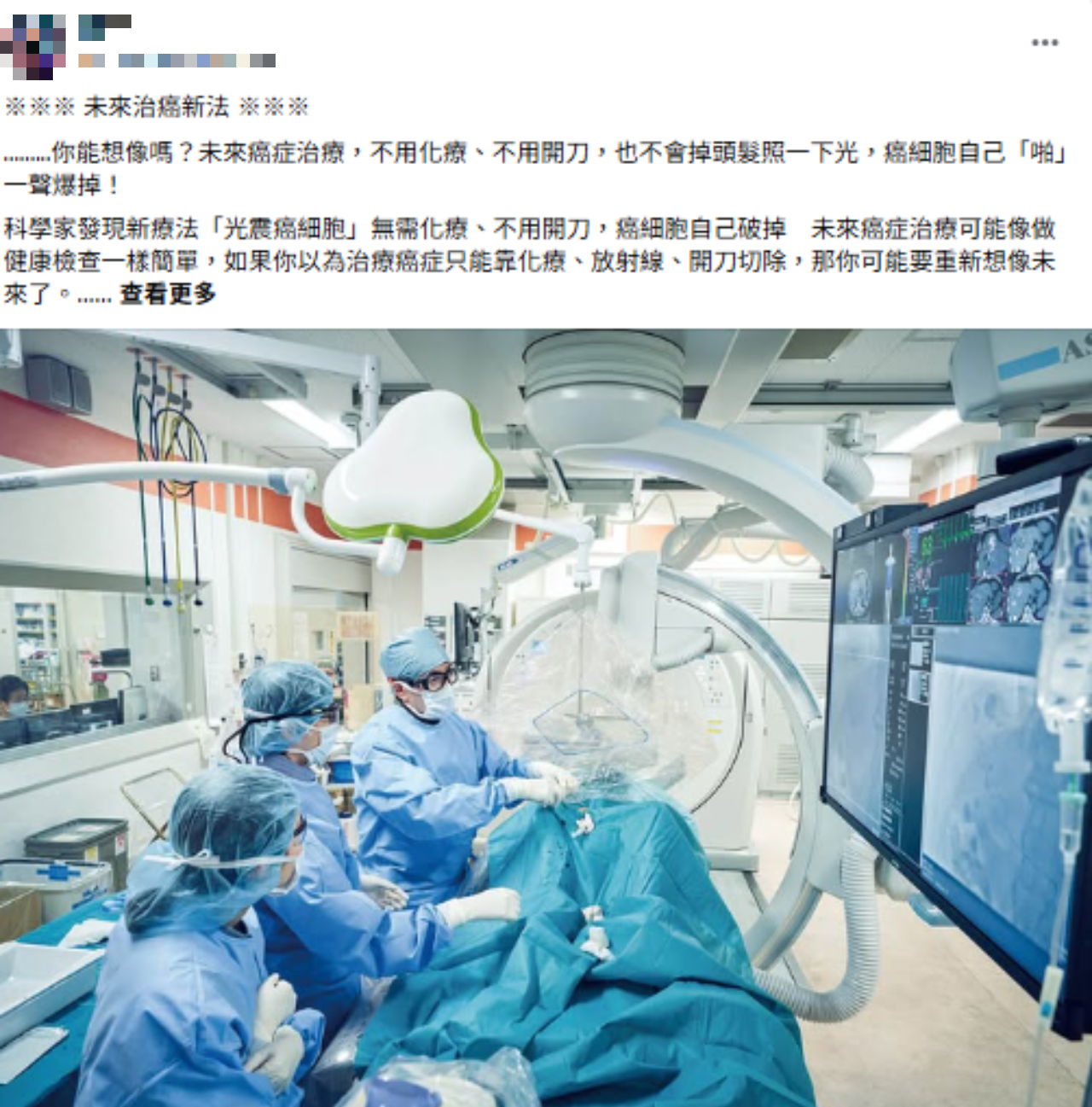 網傳不同版本的癌症治療新突破文章,提到未來癌症治療,不用化療、不用開刀,可以用光去照就能震碎癌細胞,或是利用光照引起的氧化反應、以及超音波破壞癌細胞等。但專家表示,相關的原理、技術,目前臨床上早就有類似的應用、並不像傳言所講的那麼創新或特殊,只是一般人並不理解目前臨床上所使用的療法背後的技術含量而已,傳言誇大優點、迴避缺點的敘述手法,很容易造成病患對尚未成熟的技術過度樂觀、甚至因此接受尚未核准的灰色療法,或是對目前臨床的療法產生排斥心態、沒有信心而降低配合,專家提醒民眾、病患,癌症治療人命關天,一定要與醫師充分討論,千萬不要誤信傳言、以免受害。