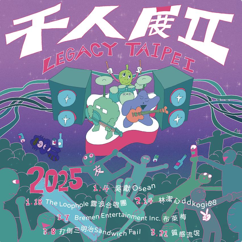 Legacy 迎來 2025 年最受矚目的系列【千人展】,挑選 6 組人氣蓬勃新銳聲音,帶來首場千人專場,預計打造下一個大勢音樂人。今日華麗公布全陣容,吳獻、露波合唱團、林潔心、布萊梅、打倒三明治、質感流氓都來了!這些獨具風格的音樂組合將於明年 1 至 3 月間輪番登上 Legacy 台北,每場專場將分階段開賣,在成為天團的路上,一起來感受他們現場不凡魅力吧!