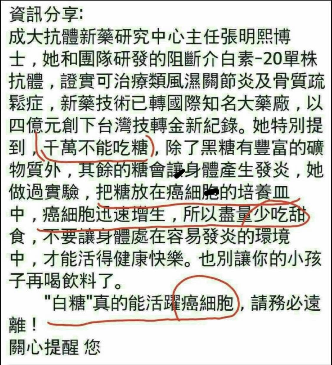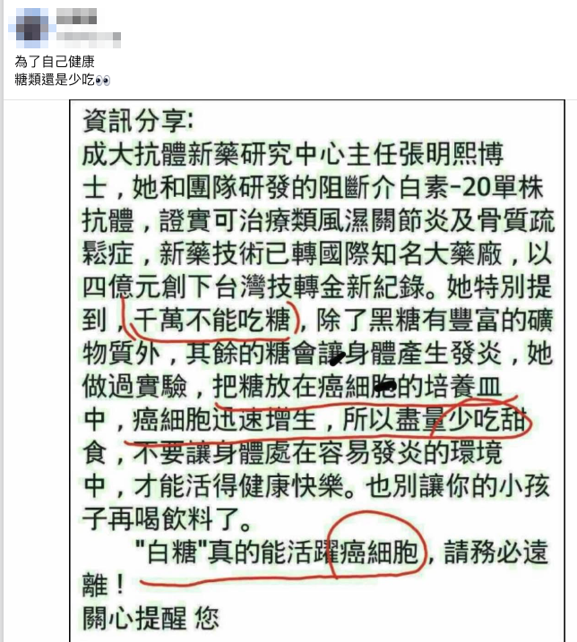 網傳「成大張明熙博士研發介白素、創下技轉金紀錄,她說除了黑糖,其餘的糖會讓身體產生發炎,把糖放在癌細胞的培養皿中,癌細胞迅速增生」貼文。但專家表示,身體的所有細胞都需要葡萄糖,癌細胞糖份需求大、利用率高,但不能因此說成癌細胞愛吃糖,傳言說法錯誤。