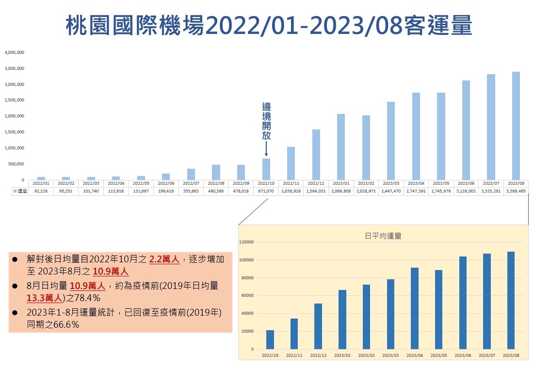桃園機場公司表示,2023年暑假客運量為671.4萬人次,超過原本預期650萬人次103%,其中8月份每日平均10.9萬人,更達疫情前同期 13.9萬人的78.4%。統計今年1至8月客運量,出境892萬8,316人次、入境883萬7,452人次、轉機405萬869人次、過境6萬4,280人次,總計2,188萬人次,已恢復疫情前同期66.6%,全年可望突破3,000萬人次。