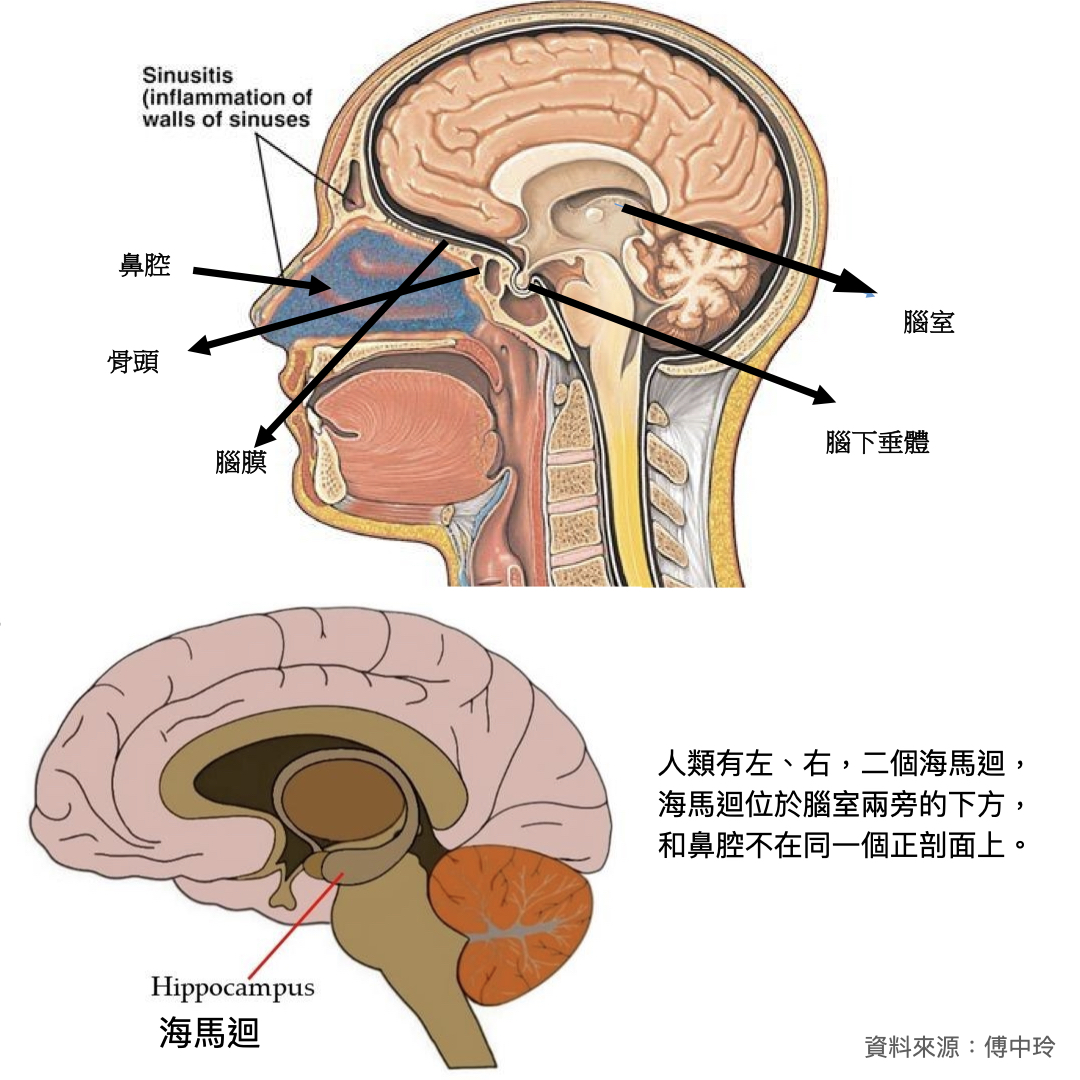 MyGoPen 諮詢台北榮總神經醫學中心副主任、台灣臨床失智症學會常務理事傅中玲,她表示鼻腔與腦中間是有屏障的,腦的最外面有腦腦殼,腦殼內有腦膜,腦膜有三層,由外往內為硬腦膜(dura mater)、蜘蛛膜(arachnoid mater)和軟腦膜(pia mater),腦膜和腦殼把腦和脊椎包起來,而且海馬迴其實在腦部靠近中心點的地方,離鼻腔有一段距離,雖然這個距離不算很遠,但重點是中間隔著很多上述的屏障,並不存在鼻涕直接碰到海馬迴的可能性。