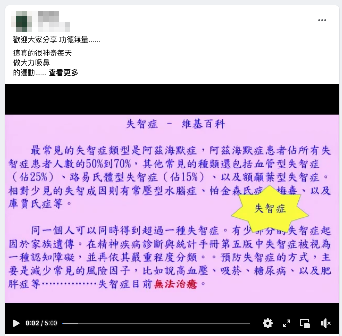 【錯誤】大力吸鼻治失智症?治癒阿茲海默症患者?錯誤影片!醫師詳解