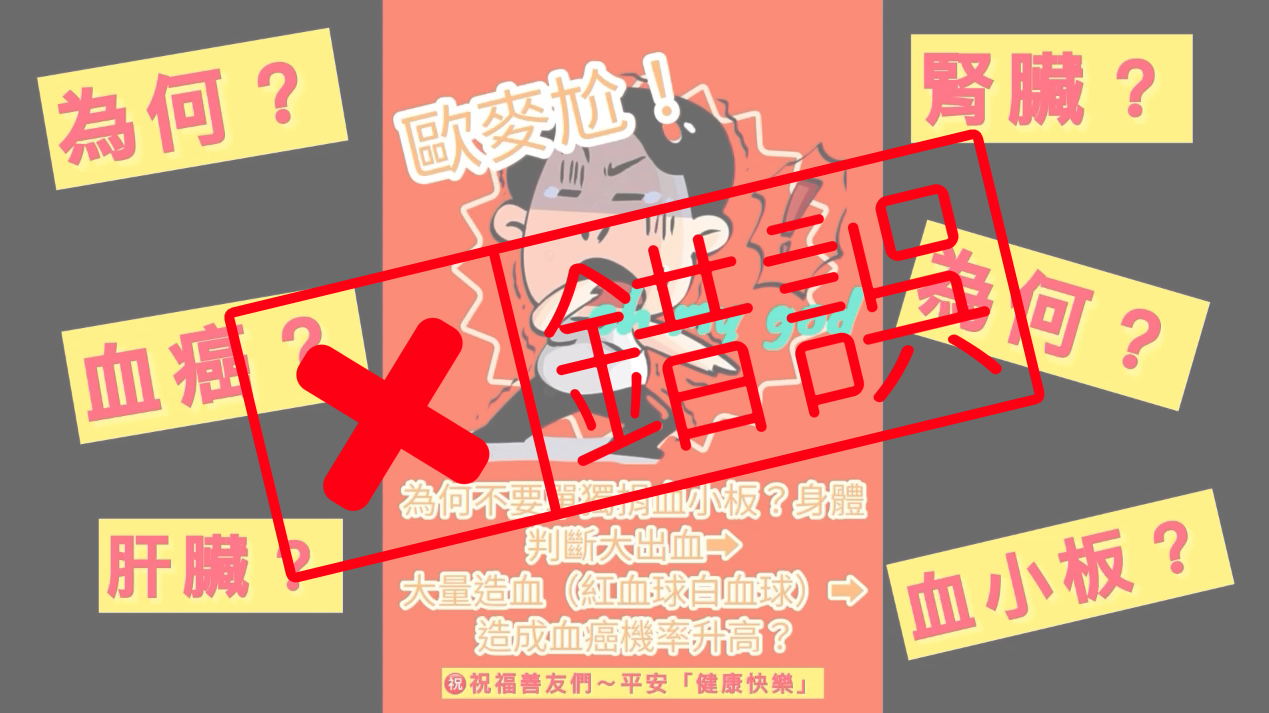 網傳「為何不要單獨捐血小板」、「造成血癌機率升高」的影片,提到只捐血小板,身體會大量造紅血球、白血球、全都造,有病例因此一周後的血癌。經查證,根據血液基金會官網,目前分離術捐血包括「分離術血小板」、「分離術白血球」、「分離術血漿」,並非只有單捐血小板一種,傳言卻說單捐血小板會造全血、得血癌,既未提出具體學依據,也無法解釋其他單捐血品,傳言為錯誤說法。