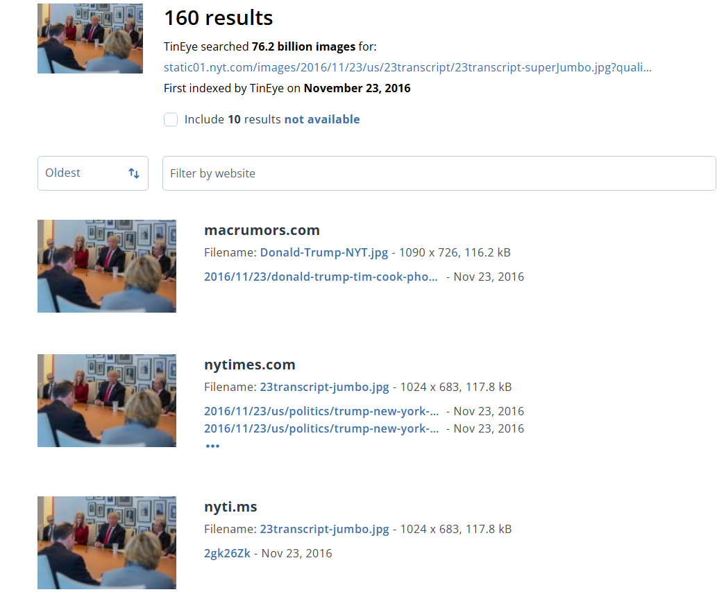 (一)以圖片反搜工具 TinEye 搜尋,查找到相同的照片最早至少在 2016 年 11 月就已經出現;檢視搜尋結果,其中包括《紐約時報》(The New York Times)2016 年 11 月 23 日發布的一篇報導。