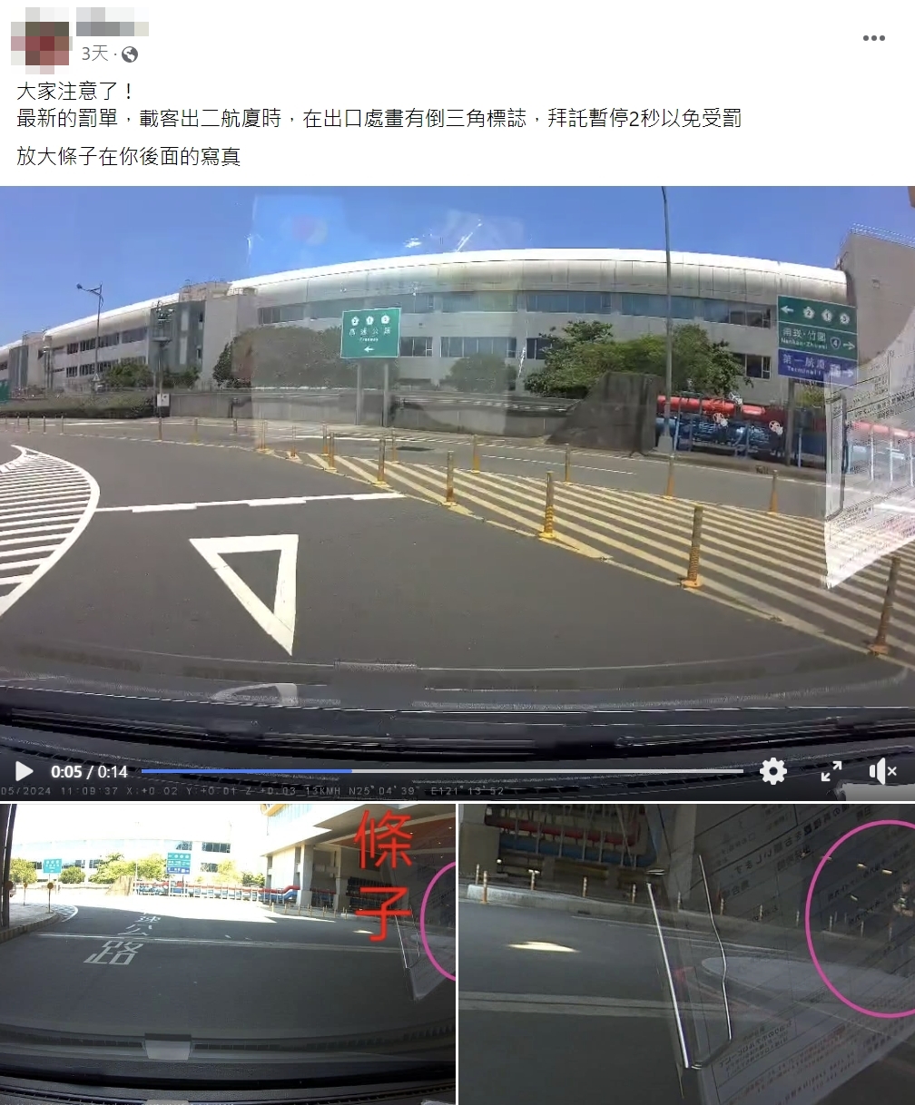最新的罰單,載客出二航廈時,在出口處畫有倒三角標誌,拜託暫停2秒以免受罰