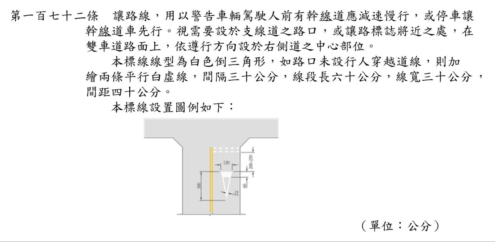 MyGoPen 於 2023 年 5 月 19 日的查核報告中,解釋過依據《道路交通標誌標線號誌設置規則》第 172 條規定,「白色倒三角形標線」為讓路線,目的是警告車輛駕駛人前有幹線道應減速慢行,或是停車讓幹線道車先行。