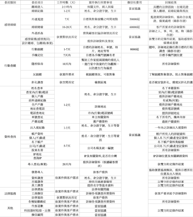 其實徵信社的工作範圍非常廣。可以說,只要你有想要調查的。不管是阿貓阿狗失蹤,到抓姦等等的服務徵信社都可以幫你!