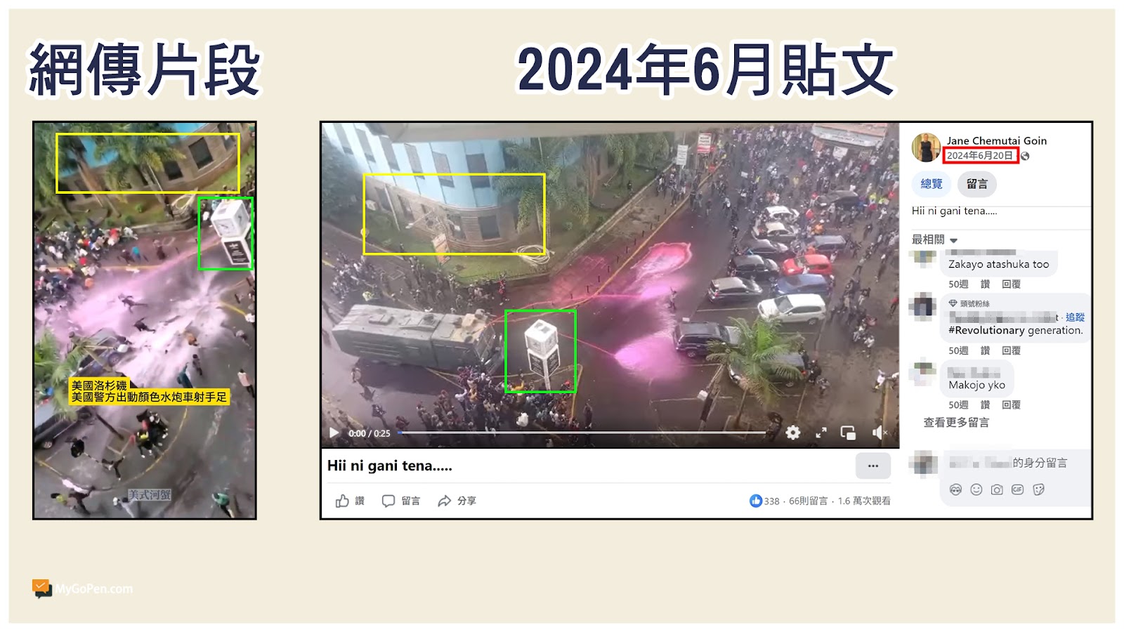 網傳「美國警方出動水砲車」的影片及訊息,畫面顯示一輛水砲車朝抗議民眾噴射粉紅色水柱,聲稱是美國洛杉磯近期爆發的示威抗議,警方對付抗議群眾的畫面。經查證,網傳影片拍攝地點是非洲國家肯亞,拍攝時間為 2024 年 6 月 20 日,當時肯亞民眾因不滿國會修改財政法,走上街頭抗議,結果遭到肯亞警方以粉色高壓水柱驅趕。網傳影片並非近期拍攝,也與美國無關,網傳訊息不正確。