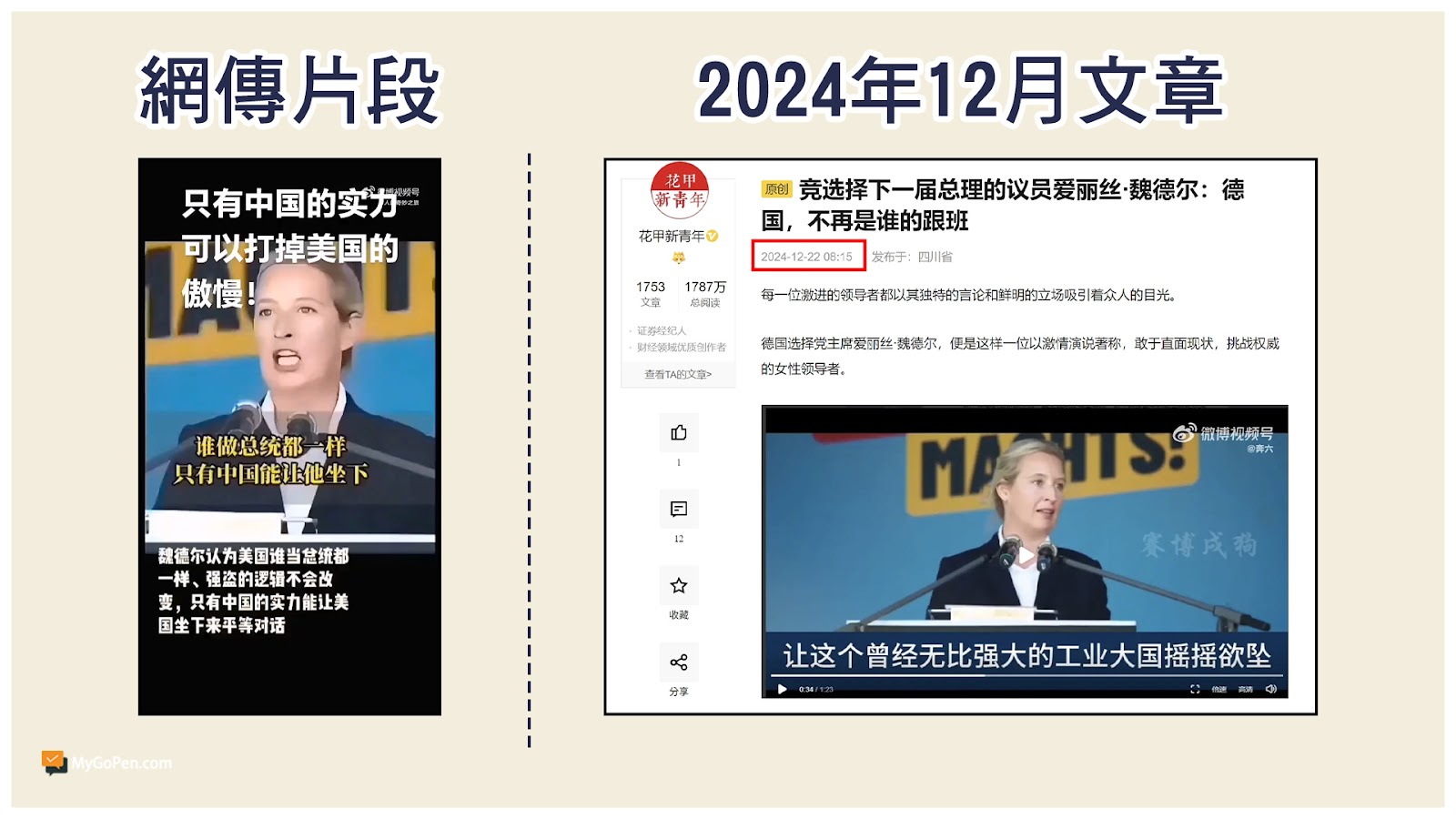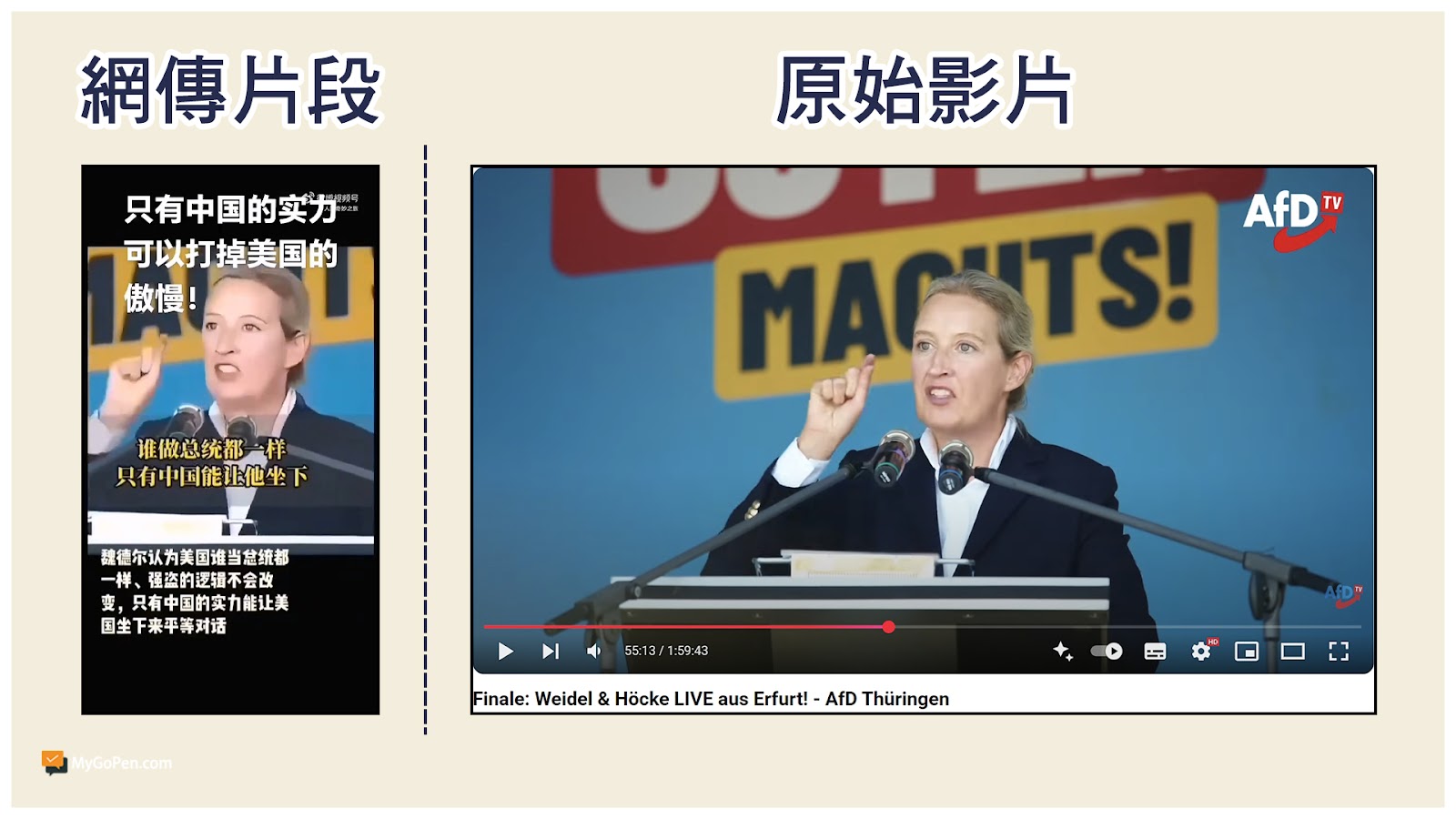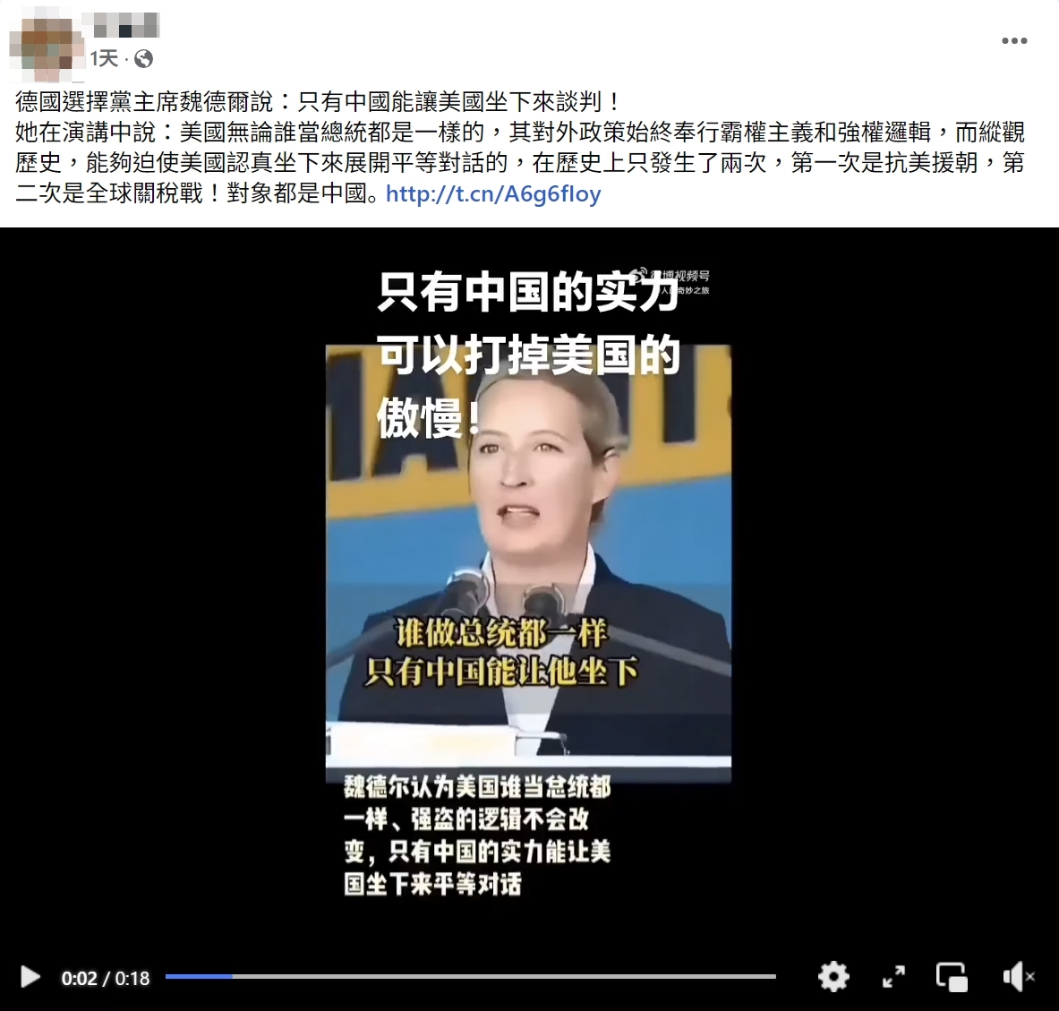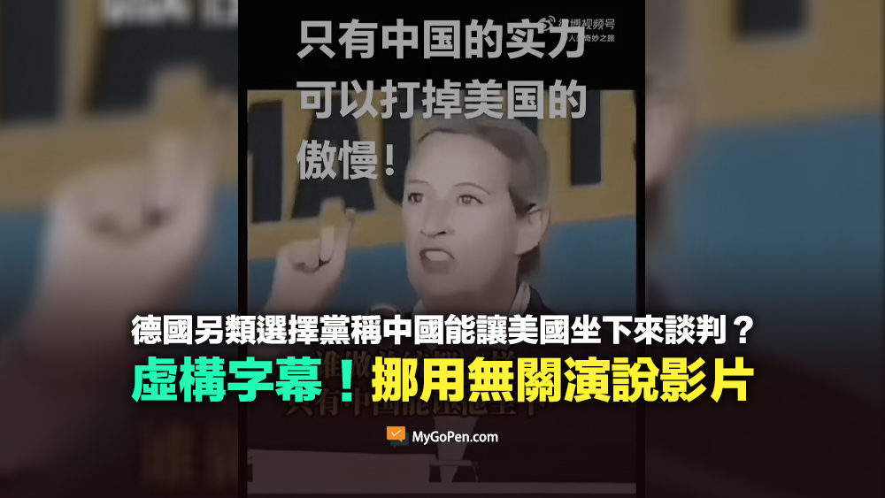 【錯誤】德國另類選擇黨稱中國能讓美國坐下來談判?虛構字幕!挪用無關演說影片