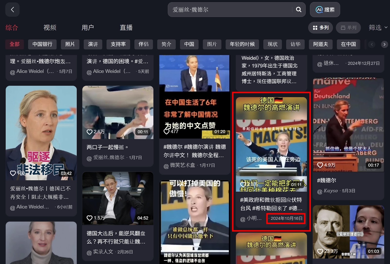 利用圖片反搜工具「Google Lens」擷圖搜索,可以找到內容農場網站「搜狐」於 2024 年 12 月 22 日發布的文章,聲稱德國選擇黨(台譯:德國另類選擇黨,AfD)黨魁愛麗絲魏德爾(Alice Weidel)在一場演說上,提到德國不該是美國的跟班,經檢視後,確認文章附圖與網傳影片為同一場景,可以得知網傳片段至少於 2024 年 12 月即在網路上出現。