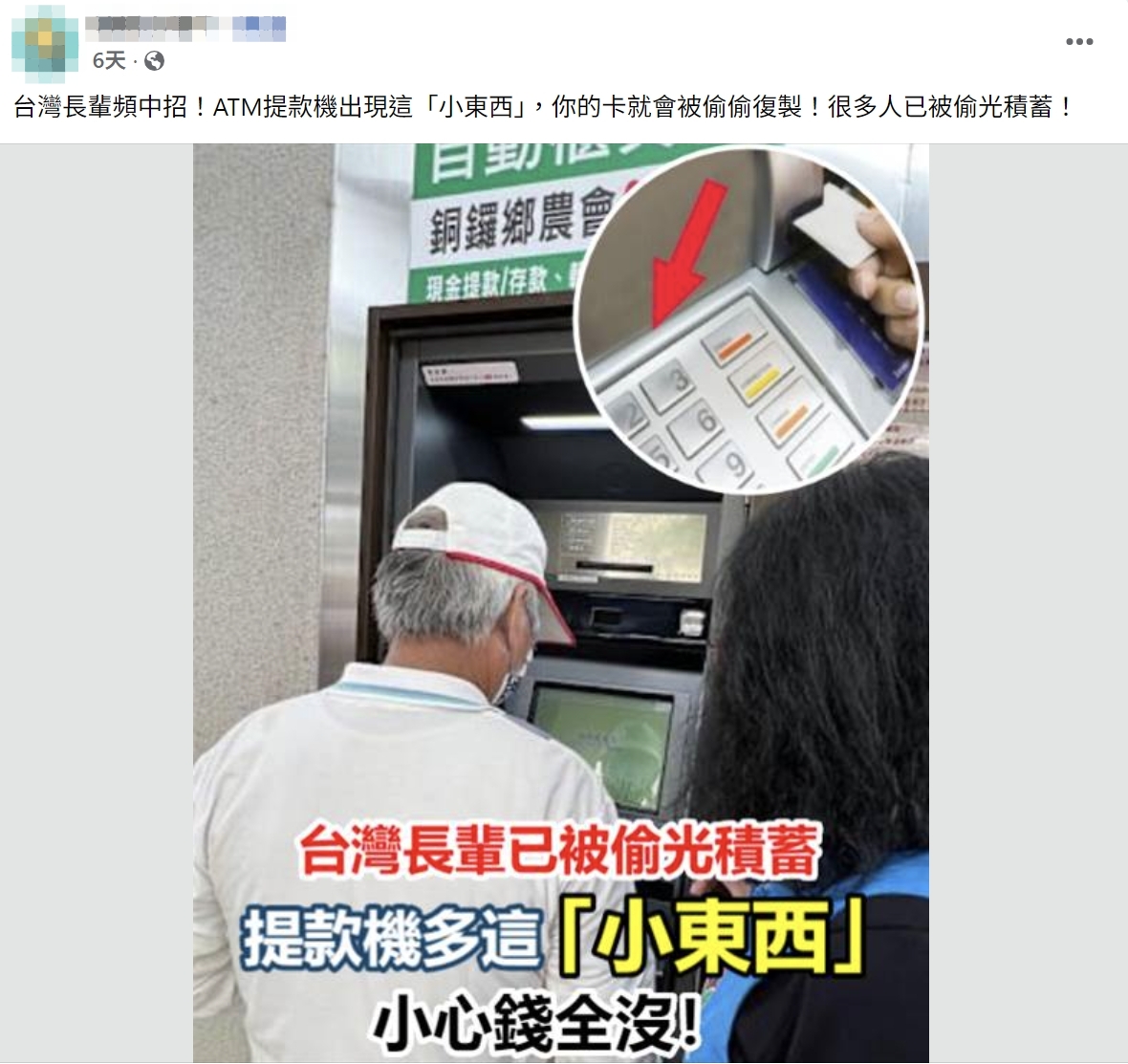 網傳「台灣長輩頻中招」的影片及訊息,內容聲稱警方近期公布一種新型詐騙手法,是在 ATM 插卡口裝設側錄機,民眾如果插卡交易,只要 3 秒卡片資料就會被複製,帳戶餘額瞬間清零。經查證,網傳影片出自內容農場頻道,ATM 遭不肖人士加裝側錄機的案例,在 2015 年及 2021 年確實曾發生過,但當時並未有民眾受害,且台灣已全面換發晶片式金融卡,已經無法利用側錄手段讀取磁條資料,刑事警察局也表示,傳言內容是舊的手法,近期並未接獲相關通報,網傳訊息不正確。