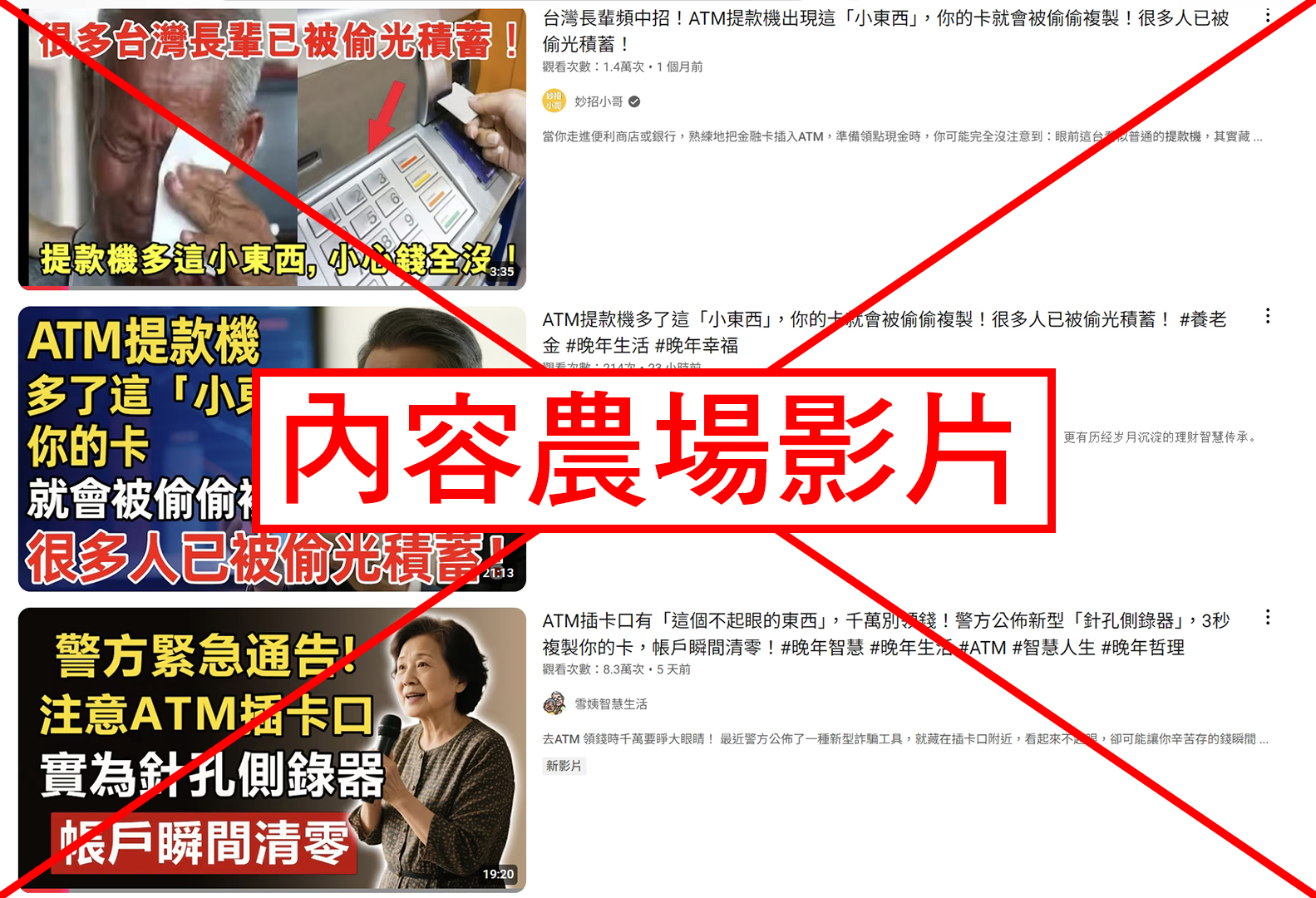 如果以「ATM提款、卡片複製」等關鍵字搜索,會發現「晚年順時生活」、「銀髮智財圈」、「妙招小哥」等頻道也發布過一樣的內容,這些都是「換湯不換藥」的影片,表面上看起來是好意提醒長輩,實際上是讓人心生焦慮感,對社會產生不信任。