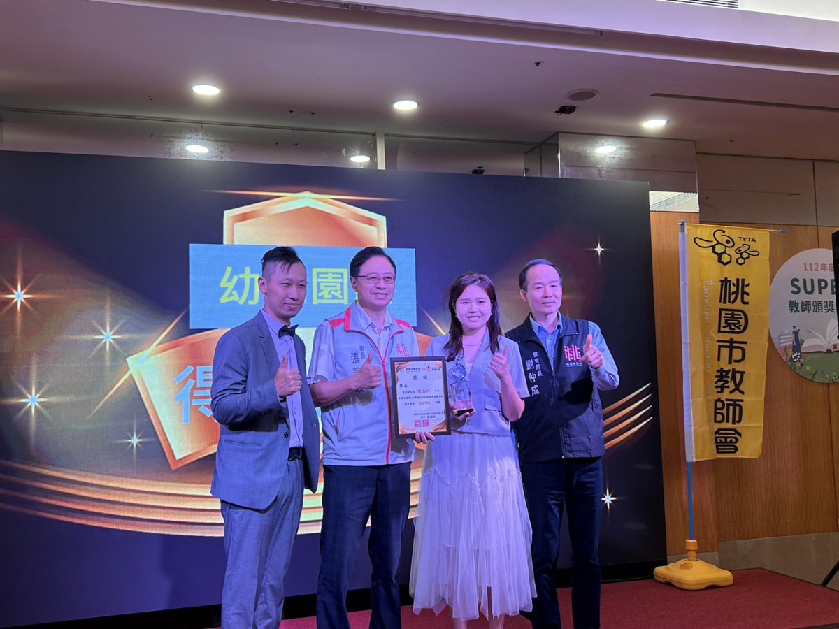 今年共有4名教師獲得SUPER教師的殊榮,將代表桃園市參加113年全國SUPER教師遴選,分別是蘆竹幼兒園陳品妍老師、仁和國小林裕峯老師、楊光國中小呂宇爵老師、壽山高中王彥翔老師;另外10名表現可圈可點的中壢幼兒園蕭珮婕老師、大華國小高曉婷老師、幸福國小陳振遠老師、長庚國小陳則穎老師、自強國中徐健銘老師、龍潭國中林玉君老師、青埔國中黃之盈老師、大園國際高中蔡銘宇老師及曹瑋珊老師、北科附工許夆池老師,則獲選今年度桃園市的SPECIAL教師。