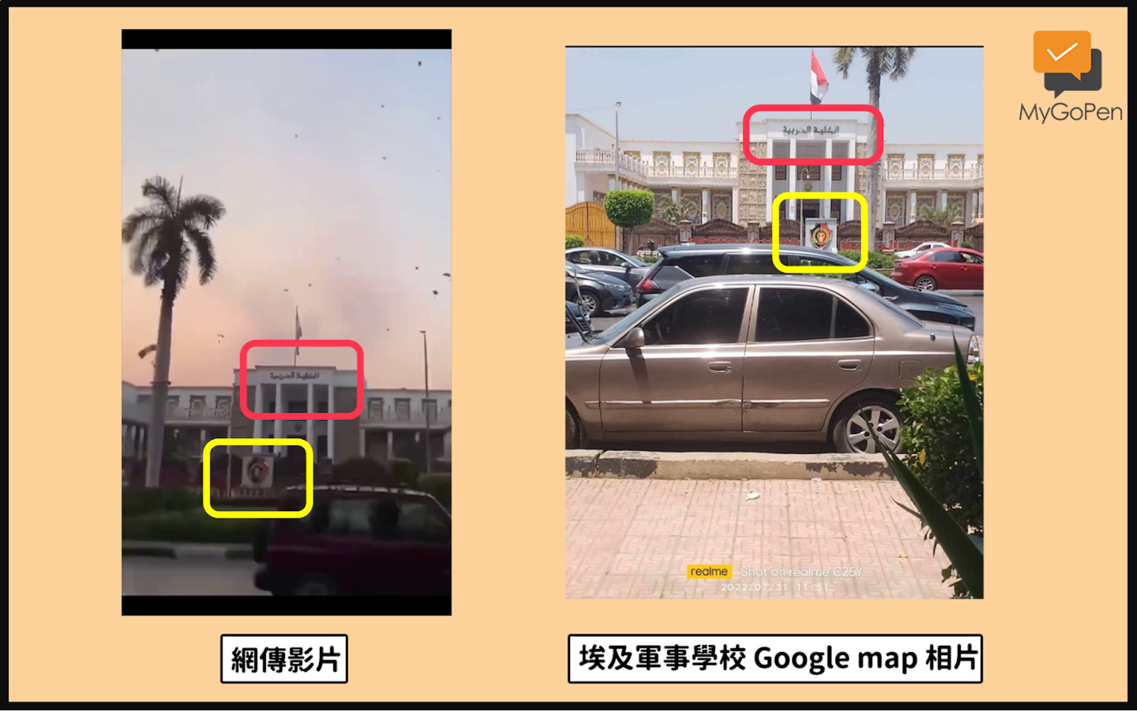(二)網傳影片中有一棟主體為白色的建築,最上方有一排文字並插有旗幟,以此為線索,將該串文字「الكلية الحربية」透過 Google lens 進行搜尋,發現其為一所位在埃及開羅的軍事學校。