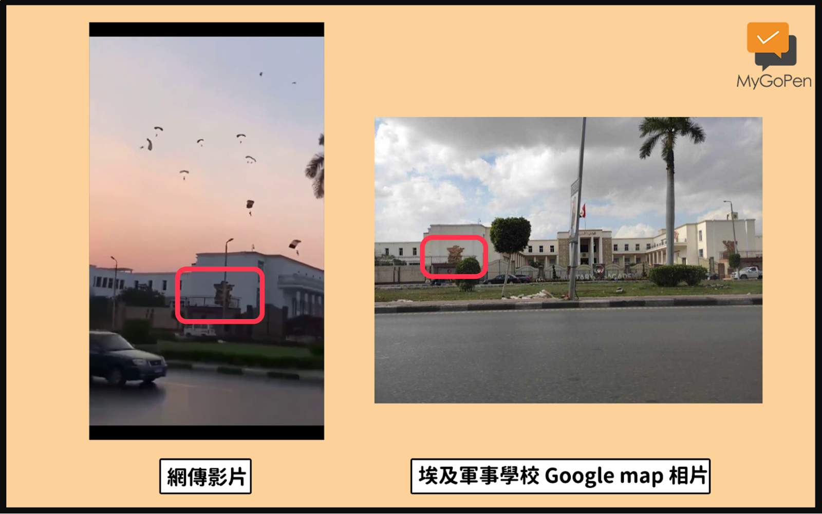 比對 Google map 上該軍事學校周圍的街景相片,可以發現建築物、地標等特徵和網傳影片中的畫面吻合,門口有相同的校徽,左右兩側也有一樣的雕像。