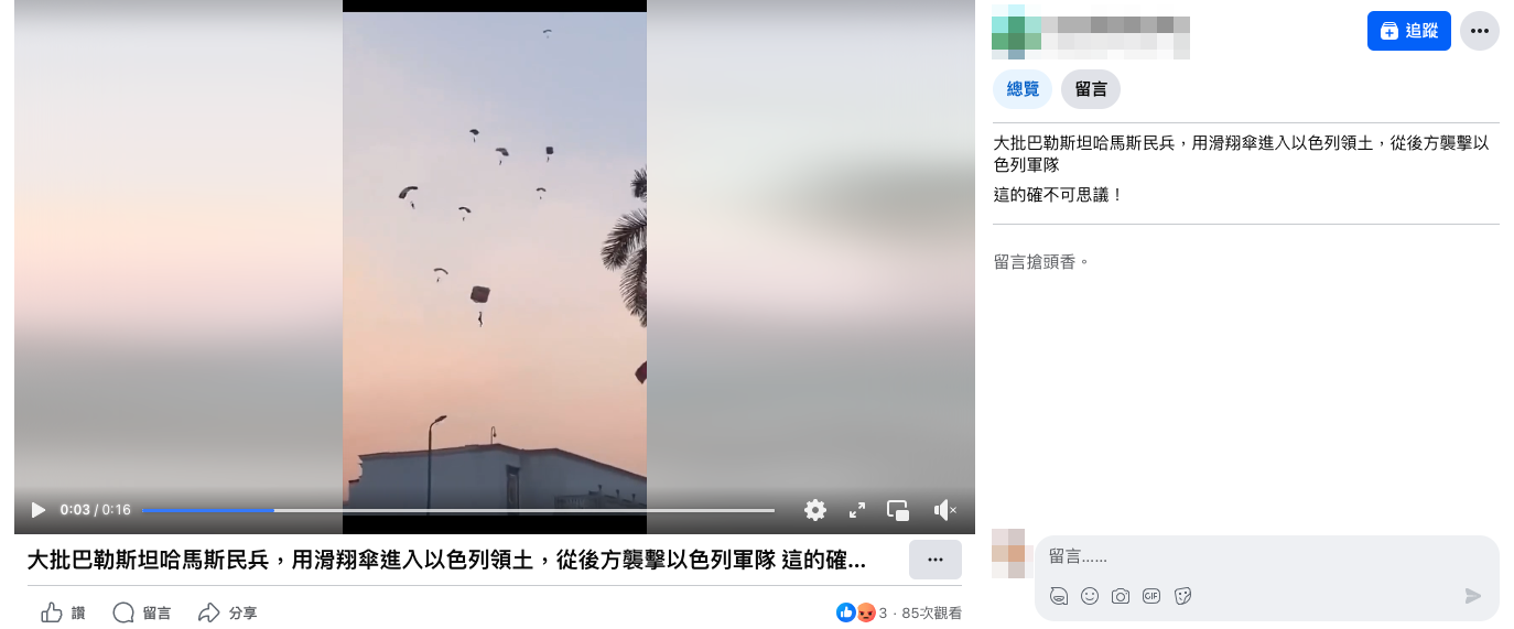 網傳「大批巴勒斯坦哈馬斯民兵,用滑翔傘進入以色列領土,從後方襲擊以色列軍隊」的訊息和影片。經查證,影片的拍攝地點在埃及開羅一所軍事學校前,並非近日以色列和巴勒斯坦發生衝突的加薩走廊;雖然無法確認影片的原始背景為何,但可知其和以色列、巴勒斯坦無關,傳言為錯誤訊息。
