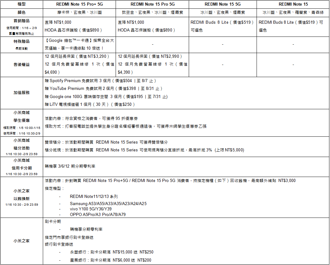 於小米商城 mi.com、蝦皮商城小米旗艦店、PChome 24h 購物小米旗艦館、momo 購物網小米旗艦館、Yahoo 購物中心小米旗艦館、東森購物網小米旗艦館、7-ELEVEN i 預購小米旗艦館,以及小米之家等指定通路購買 REDMI Note 15 Pro+ 5G 或 REDMI Note 15 Pro 5G 即可享新機直降 1,000 元,並加贈 HODA 晶石保護殼乙個。購買 REDMI Note 15 5G 或 REDMI Note 15 則加贈 REDMI Buds 8 Lite。