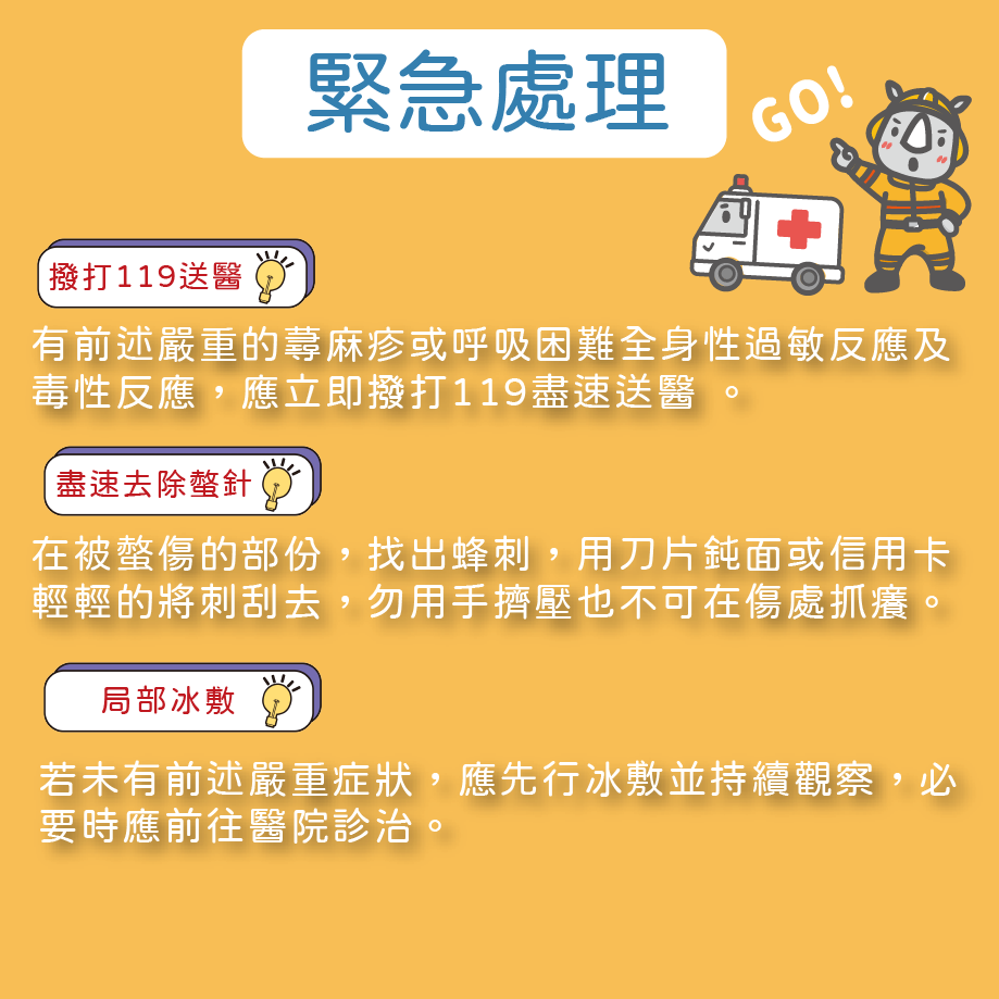 MyGoPen 查詢具代表性的公開資料,根據長庚醫院的衛教「蜂叮」,提到除了紅腫痛癢,還有一些更重要的反應要注意: