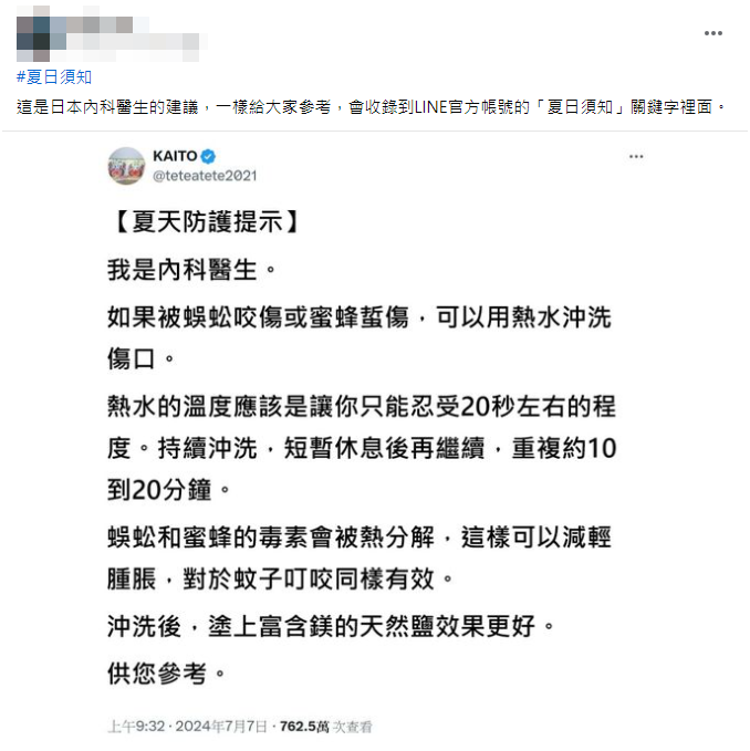 網傳「夏天防護提示」的貼文、並且有網紅轉貼,提到被蜈蚣咬傷或蜜蜂螫傷,可以用熱水沖洗傷口,蜈蚣和蜜蜂的毒素會被熱分解,塗上富含鎂的天然鹽效果更好。但專家表示,蜈蚣叮咬所造成的傷口可能帶有細菌、蜂螫的傷口可能留有蜂刺,當被叮咬的傷口超過 10 處以上時甚至可能有毒性反應,而即使只被螫咬一處也可能發生過敏性反應,這些都不可能是熱水、鹽巴可以改善或治療的,傳言說「毒素會被熱分解掉」,專家闢謠「那是絕不可能的事情」,提醒民眾在野外碰到叮咬事件,與其忙著找這些沒有用的熱水、鹽巴,還不如趕快送醫比較實際。