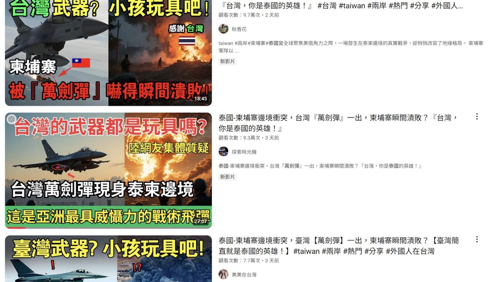 此外,「泰國使用台灣萬劍彈」的謠言,不只「韓妹tv」發布影片,其他像是「中華奇聞趣事」、「秋香花」、「探索時光機」、「美美在台灣」、「熙儿娱乐」、「阿笨哥」等 YouTube 頻道,幾乎都在同一時間發布與該主題有關的影片,而這些帳號也幾乎都是內容農場頻道。