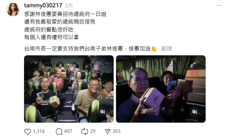 網傳「感謝林俊憲委員招待總統府一日遊」的訊息和影片。MyGoPen 實際致電林俊憲辦公室詢問,辦公室表示,這是各地鄉親們自行安排的總統府、立法院參訪行程,他們沒有招待民眾到總統府一日遊,只是自己選區的鄉親旅遊團到立法院時會負責接待,這樣的參訪團藍、綠、白都有,禮品也是總統府、立法院本來就會送給參訪團體的,傳言影片貼文描述缺乏相關脈絡,易造成誤解。
