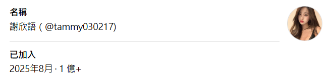 檢視發布網傳影片的 Threads 帳號「tammy030217」,根據其 Instagram 帳號的個人資料簡介,其於 2025 年 8 月才剛加入。