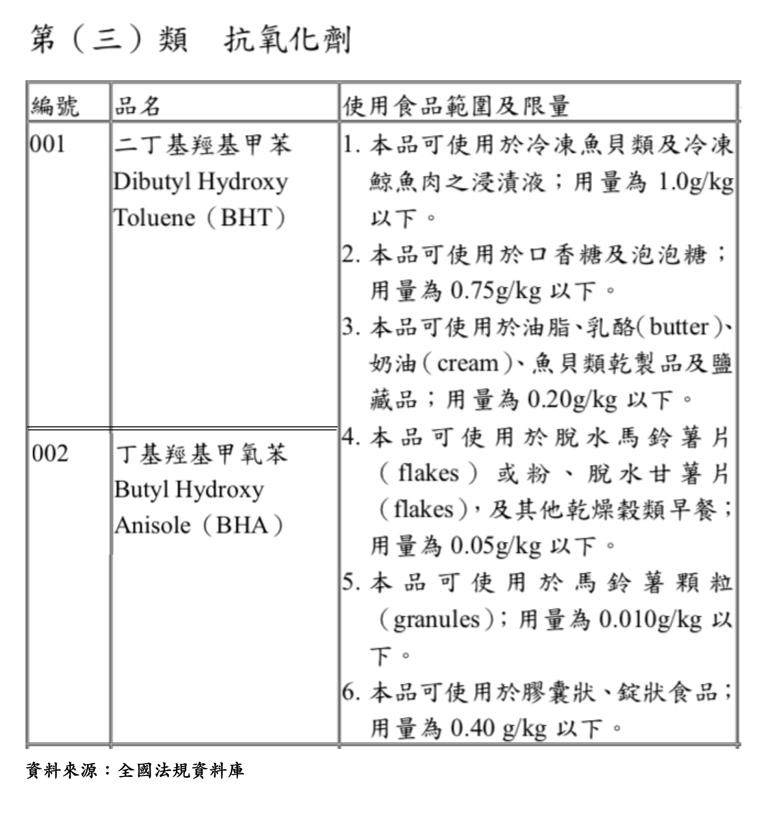 臺灣食藥署准用的食品添加物正面表列中,BHT、BHA 即為第三大類「抗氧化劑」中編號第 1、第 2 的常用成分,准用範圍包括「乾燥穀類早餐」,限量為每公斤 0.05 克以下,顯示日本、臺灣雖然都准用 BHT、BHA,但各國實際執行的細節不同。