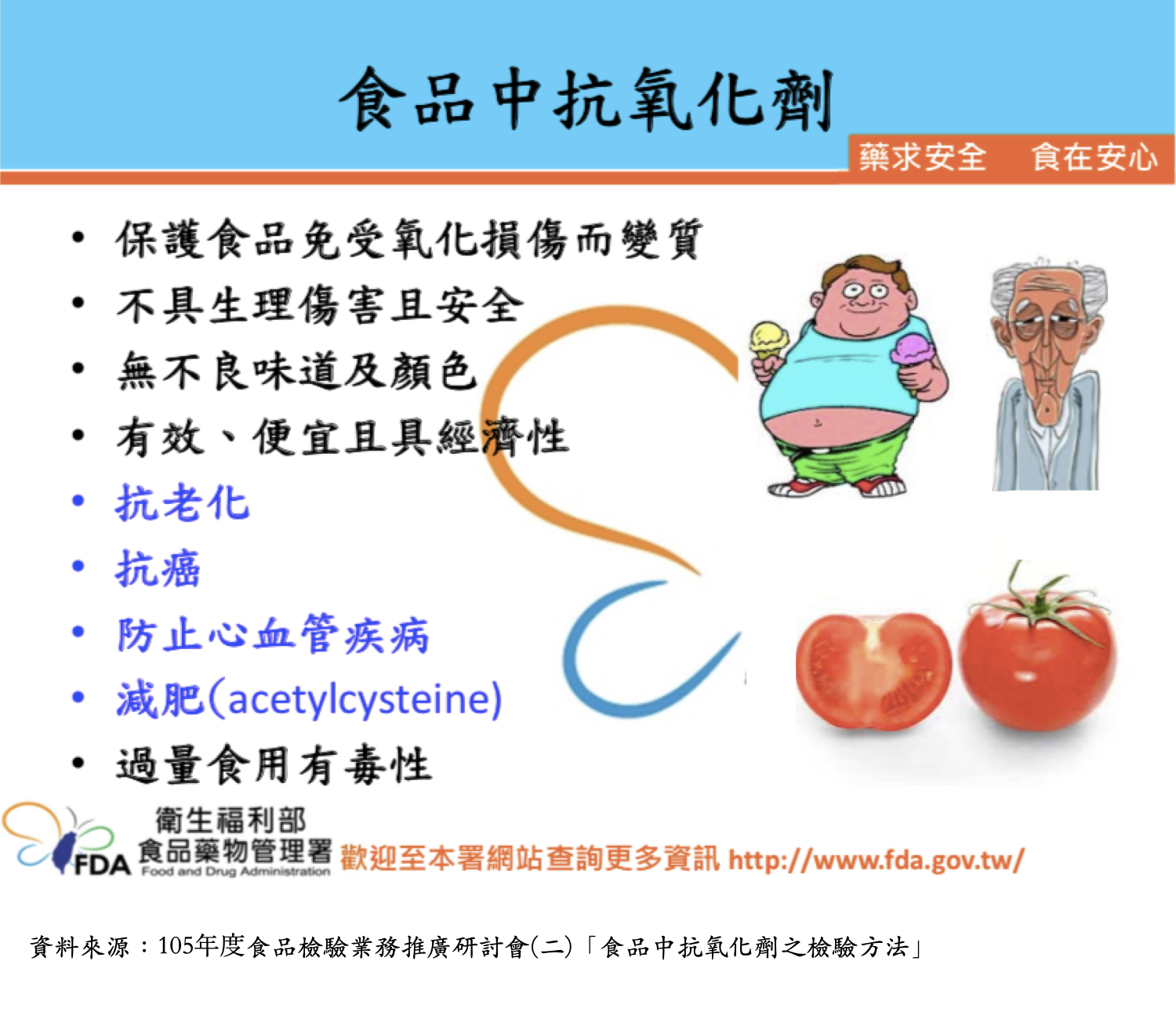 且食藥署於「105 年度食品檢驗業務推廣研討會(二)」的「食品中抗氧化劑之檢驗方法」公開資料中,也提到抗氧化劑作為食品添加物有以下作用: