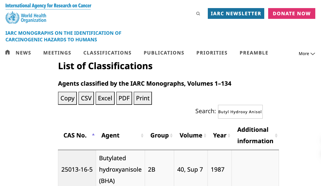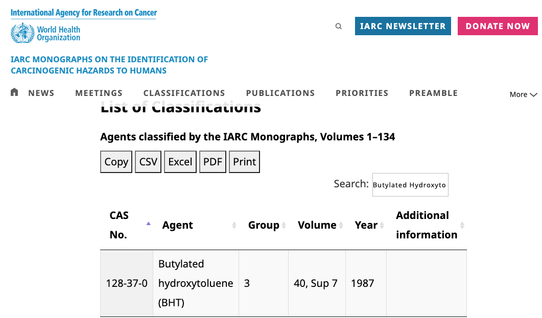 傳言提到「含有 BHT 及 BHA 會致癌」應為錯誤說法,根據 IARC分類,BHT為第 3級、BHA 為第 2B 級致癌物,一般都以第 1 級(carcinogenic to humans)、2A 級(Probably carcinogenic to humans)為口語中所說的「致癌物」,BHA只列為2B級,BHT甚至是致癌性更低的第 3 級。