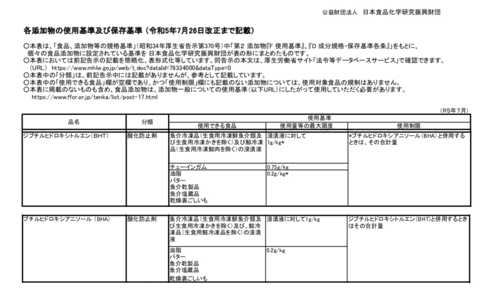 日本食品化學研究振興財團(公益財團法人)第7頁、第 13頁 - 各添加物の使用基準及び保存基準 (令和5年7月26日改正まで記載)