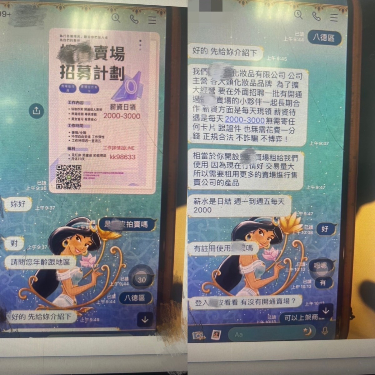 據了解,陳女平常在家帶小孩,會從事兼職貼補家用,她在臉書刊登出租蝦皮賣場,有一名自稱是化妝品公司人員和她聯絡,表示為了擴大經營要找一批有開通過蝦皮帳號的夥伴長期經營,只要以每日租金2千至3千元租帳號,並拿10萬元入股所賣的商品還能抽%,要陳女去貸款並辦理約定帳號,對方一開始表示投資1萬元公司會補助2萬,陳女不疑有他先轉1萬過去,並提供帳號給對方,後來對方又鼓吹再加碼投資10萬,可以賺更多,陳女才到銀行要辦貸款,員警現場舉出類似案例勸說,如果把帳號隨意租借給他人行騙,會涉及幫助詐欺罪嫌,帳戶因此被凍結,陳女聽完才恍然大悟、驚覺事情的嚴重性,及時打消貸款念頭。
