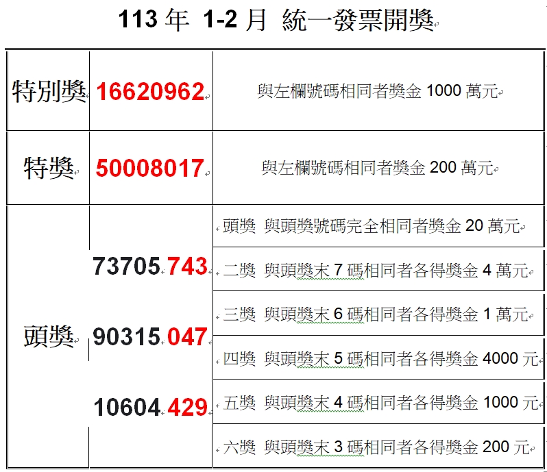 財政部25日開出113年1、2月期統一發票獎號,開獎資訊為,1000萬特別獎號碼16620962,200萬元特獎號碼50008017,200萬頭獎號碼73705743、90315047、10604429。