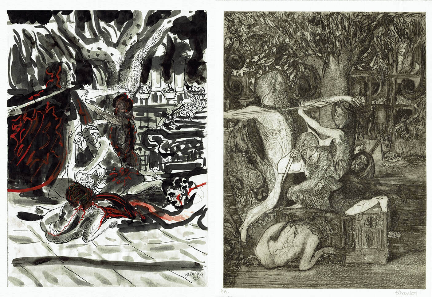 作品中蘊含大量歐洲神話元素的藝術家卡洛斯,以《埃涅阿斯紀La Eneida》中的史詩為題創作了一系列的手稿與版畫。這部史詩是古典拉丁的世界觀中,非常重要的基石之一。而卡洛斯的創作計畫歷經了兩年的前期研究,試圖以眾神的視線理解這個世界,再將之以當代藝術的樣貌呈現。卡洛斯對於史實詮釋以及人物場景的刻畫一直非常敏銳,作品在歐洲各地廣受推崇。卡洛斯本次參展,除了版畫之外也呈現了難得一見的手稿。細觀系列作品,就像是進入了拉丁語系的洪流中、感受到的是神性與人性的精神連結。