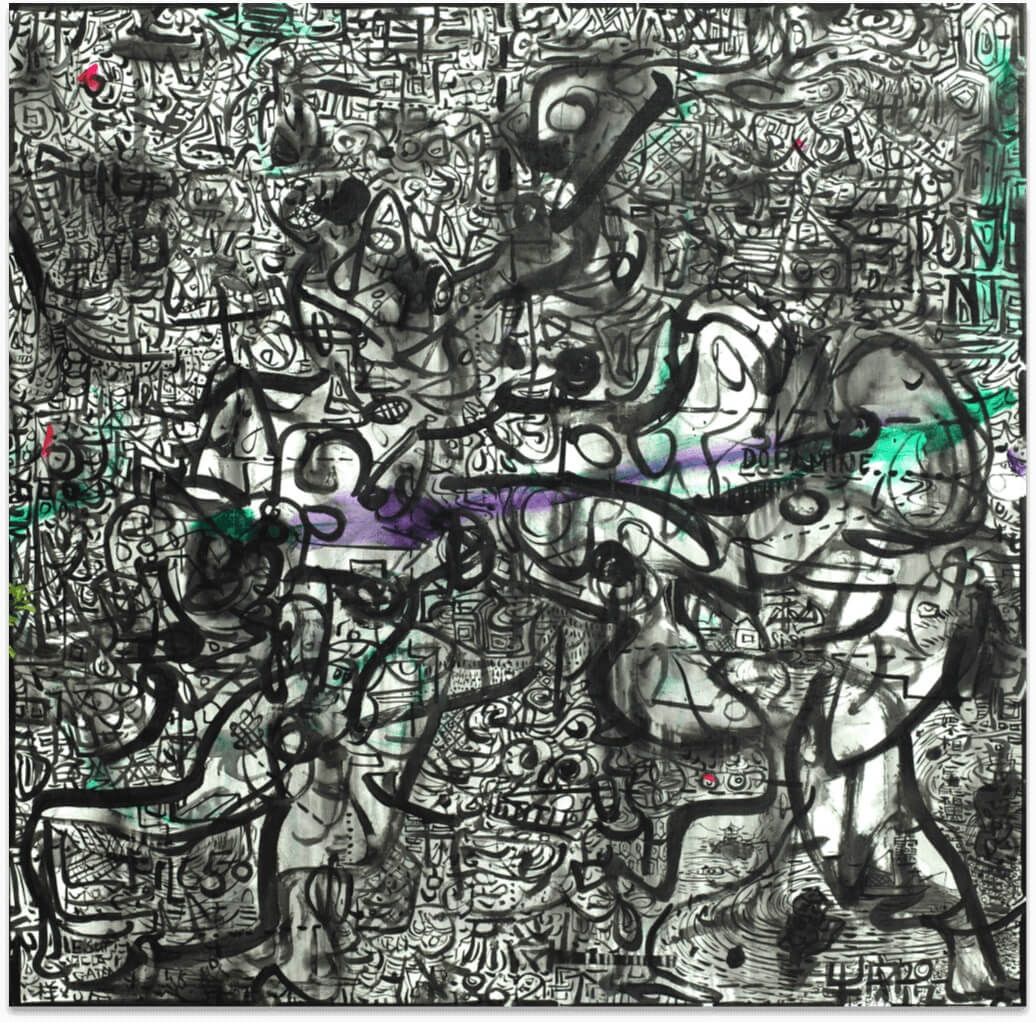 周遊全球生活、創作的藝術家牛安,一直以來都以相當積極自在的心境,詮釋著各式各樣的見聞與體悟。各系列的作品,都反應著古典文人在當代的精神追求。本次參展的《隱》系列,在半抽象的寫意筆法中,首先呈現出了牛安自幼養成的書畫底蘊。豐富運筆乍看是紛亂的,卻在細觀時會發現個語言的文字數字因循著某種規則排列。透過敦煌佛教、山海經、西遊記等等符號的解構與並置,將古今文化交知在了一起。牛安此系列卻並非是古典故事的詮釋。而是藉由潛而不言的符號,傳遞出傳統東方文化裡「意在言外」、「隱而不宣」的哲學思維。